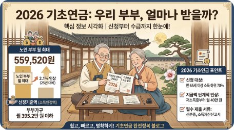 부모님 혹은 본인이 만 65세가 넘었는데 “기초연금 받을 수 있는지” 모르고 계신 분들이 생각보다 많습니다. 실제로 주민센터에 문의해봤더니 자격이 되는데도 신청을 안 하고 있었던 어르신이 꽤 계셨습니다. 이 글에서는 2026년 기초연금 수급 자격, 신청 방법, 금액, 소득인정액 계산법, 그리고 탈락 이유까지 빠짐없이 안내해 드립니다. 기초연금은 매달 최대 342,510원(단독가구 기준, 2026년 4월 기준)을 받을 수 있는 … 더 읽기